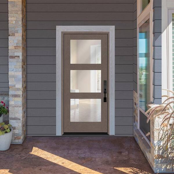 Regency 30 in. x 80 in. Modern 3-Lite Equal Clear Glass LHIS Ashwood Stain Mahogany Fiberglass Prehung Front Door