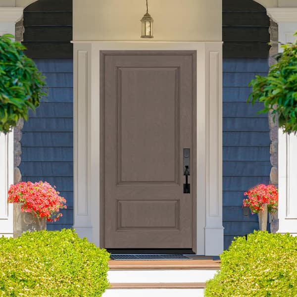 • Exterior entry woodgrain fiberglass prehung door resists weather