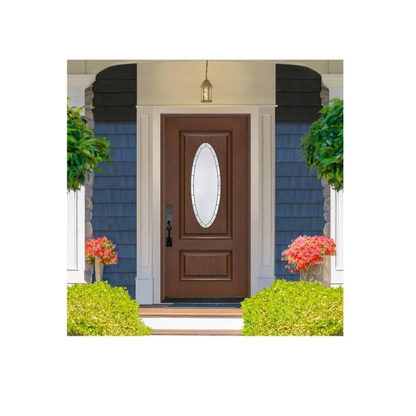 Regency 36 in. x 80 in. 3/4L Oval Empire Decorative Glass RHIS Chestnut Fiberglass Prehung Front Door with 4-9/16 Jamb
