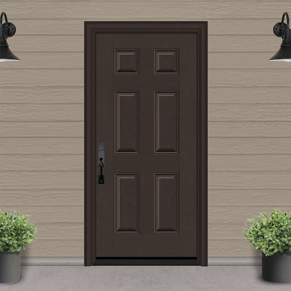 Regency 36 in. x 80 in. 6 Panel RHIS Hickory Stain Mahogany Fiberglass Prehung Front Door with 6-9/16 Jamb