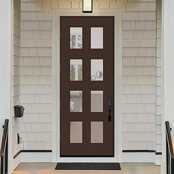 Regency 42 in. x 96 in. 8L Modern Clear Glass RHOS Chestnut Stained Fiberglass Prehung Front Door w/4 in. Jamb