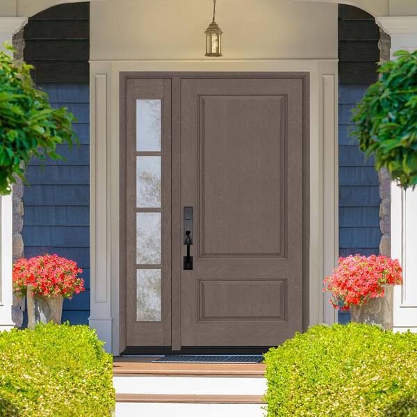 • Exterior woodgrain fiberglass door with sidelite resists weather
