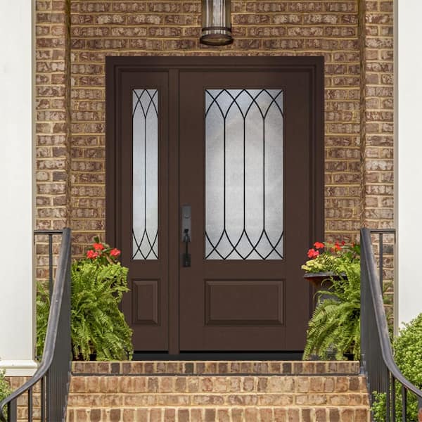 Regency 51 in. x 80 in. 3/4-Lite Spire Decorative Glass RHIS Chestnut Mahogany Fiberglass Prehung Front Door w/12 in. SL