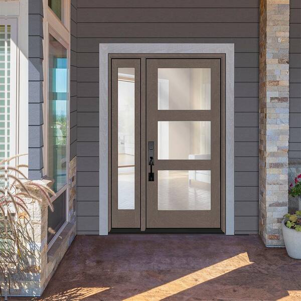 Regency 51 in. x 80 in. Modern 3-Lite Equal Clear Glass RHIS Ashwood Mahogany Fiberglass Prehung Front Door 12 in. SL