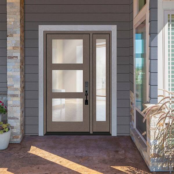 Regency 51 in. x 80 in. Modern 3-Lite Equal Clear Glass RHOS Ashwood Mahogany Fiberglass Prehung Front Door 12 in. SL