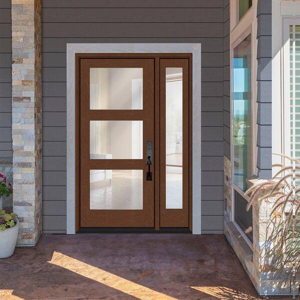 Regency 51 in. x 80 in. Modern 3-Lite Equal Clear Glass RHOS Chestnut Mahogany Fiberglass Prehung Front Door w/12 in. SL