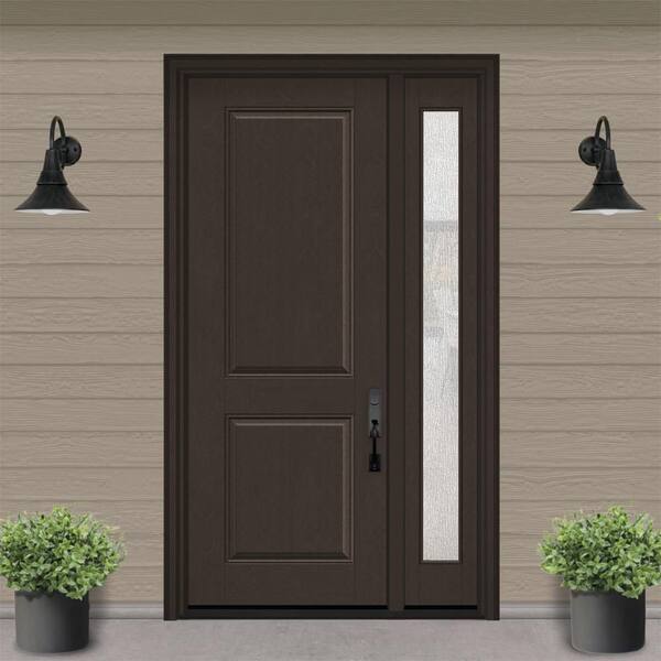 Regency 51 in. x 96 in. 2P Squaretop LHIS Hickory Stain Mahogany Fiberglass Prehung Front Door with Rain 12in. SL 4-9/16