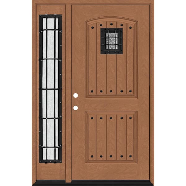 • Exterior woodgrain fiberglass door with sidelite resists weather