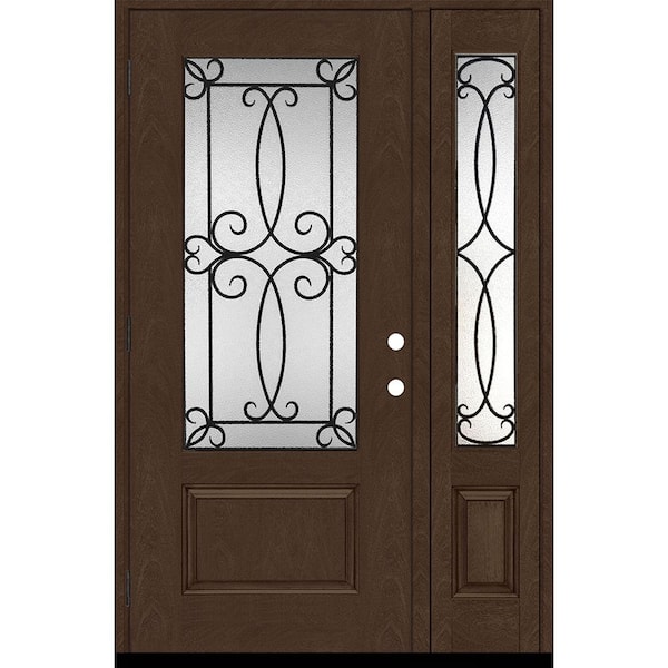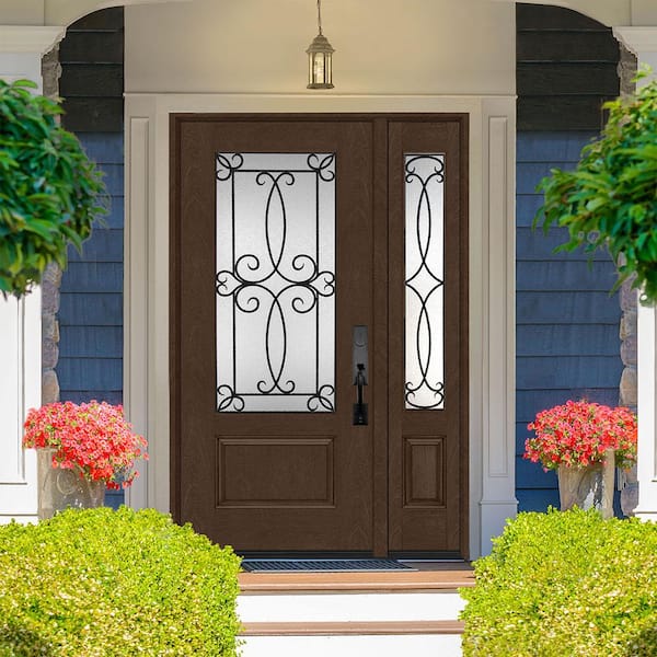 Regency 53 in. x 80 in. 3/4-Lite Georgian Decorative Glass RHOS Hickory Mahogany Fiberglass Prehung Front Door 14 in. SL