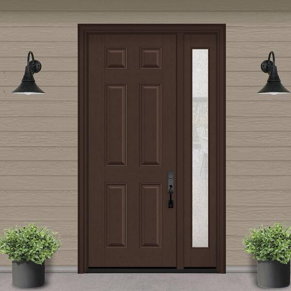 Regency 53 in. x 96 in. 6 Panel LHIS Chestnut Stain Mahogany Fiberglass Prehung Front Door w/Rain14in. SL 6-9/16