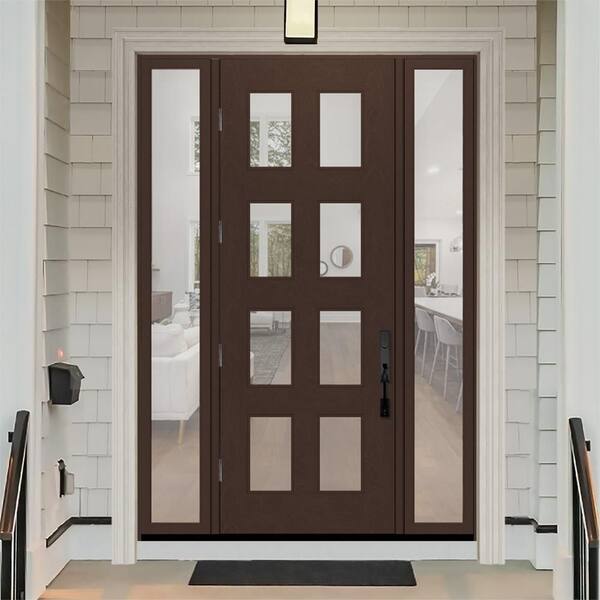 Regency 60 in. x 96 in. 8L Modern Clear Glass RHOS Chestnut Stain Fiberglass Prehung Front Door w/Clear10in. SLs 4-9/16