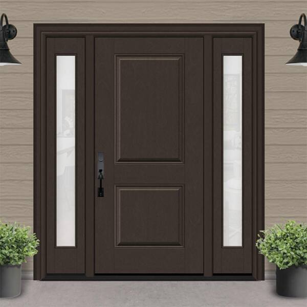 Regency 64 in. x 80 in. 2P Squaretop RHIS Hickory Stain Mahogany Fiberglass Prehung Front Door w/Obscure12in. SLs 4-9/16