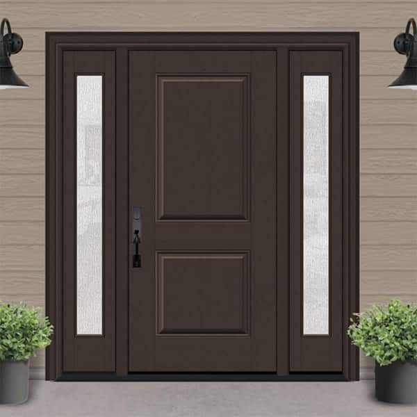 Regency 64 in. x 80 in. 2P Squaretop RHIS Hickory Stain Mahogany Fiberglass Prehung Front Door with Rain12in. SLs 4-9/16