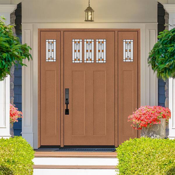 • Exterior woodgrain fiberglass door with sidelites resists weather