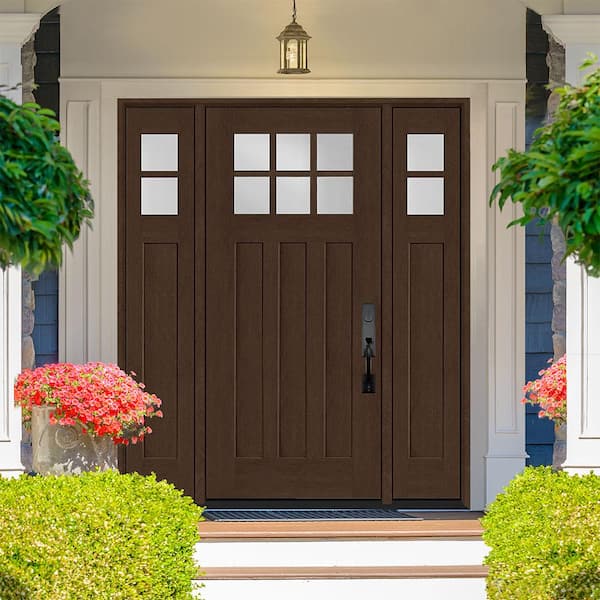 Regency 64 in. x 80 in. 6-Lite Top Lite Clear Glass RHOS Mahogany Fiberglass Prehung Front Door 12 in. Side Lites