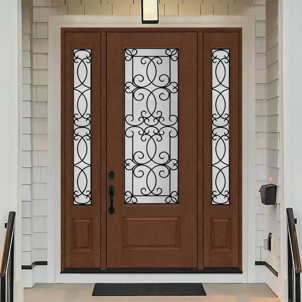 Regency 64 in. x 96 in. 3/4Lite Georgian Decorative Glass RHIS Chstnt Mahogny Fiberglass Prehung Front Door w/Dbl12in.SL