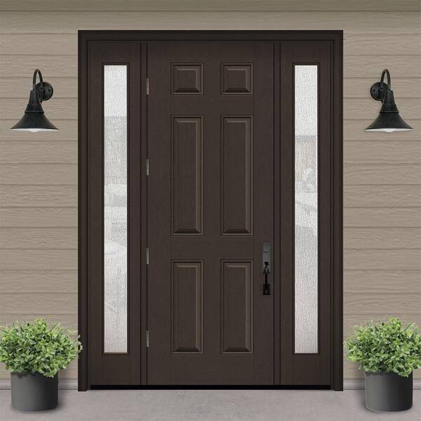 Regency 64 in. x 96 in. 6 Panel RHOS Hickory Stain Mahogany Fiberglass Prehung Front Door w/Rain12in. SLs 4-9/16