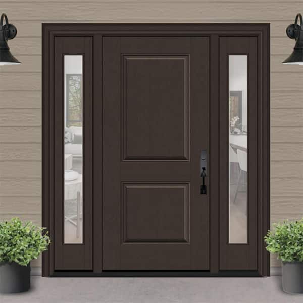 Regency 68 in. x 80 in. 2P Squaretop LHIS Hickory Stain Mahogany Fiberglass Prehung Front Door w/Clear 14 in. SLs 4-9/16