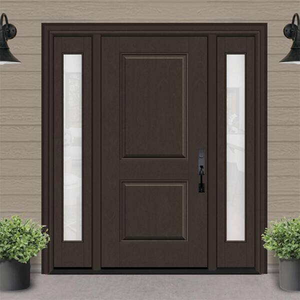 Regency 68 in. x 80 in. 2P Squaretop LHIS Hickory Stain Mahogany Fiberglass Prehung Front Door w/Obscure14in. SLs 4-9/16