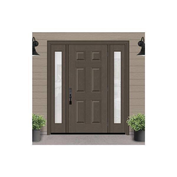 Regency 68 in. x 80 in. 6-Panel LHOS Ashwood Stain Mahogany Fiberglass Prehung Front Door with Obscure 14 in. SLs 6-9/16