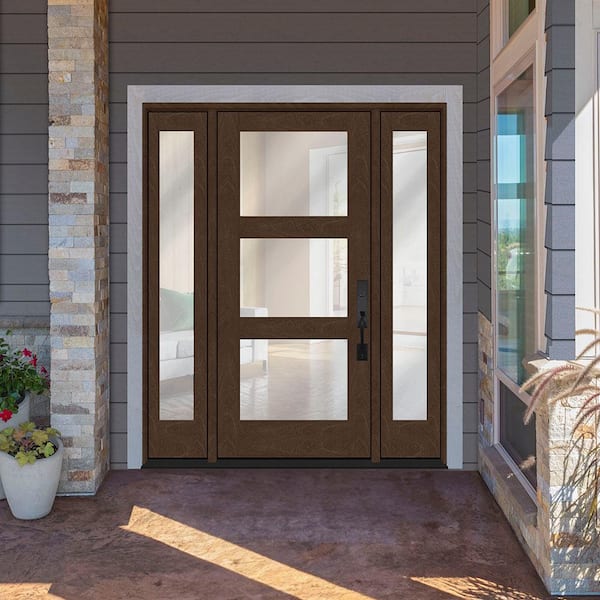 Regency 68 in. x 80 in. Modern 3-Lite Equal Clear Glass RHOS Hickory Mahogany Fiberglass Prehung Front Door DB 14 in. SL