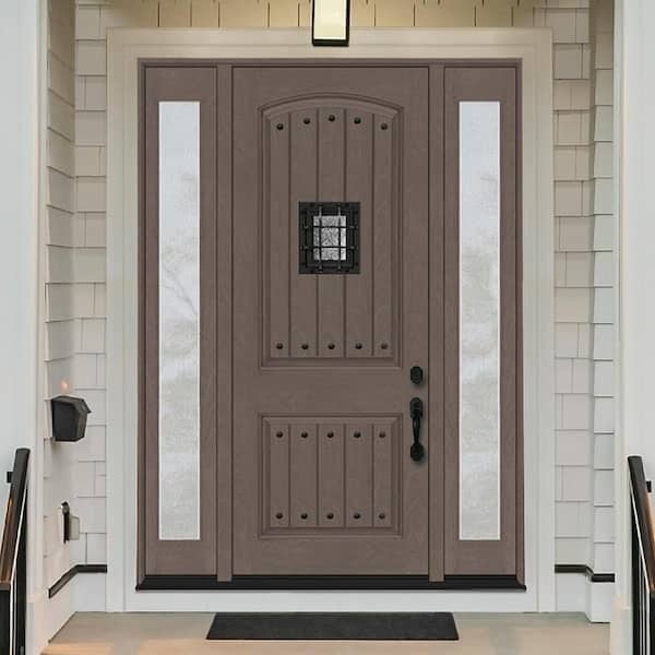 • Exterior woodgrain fiberglass door with sidelites resists weather