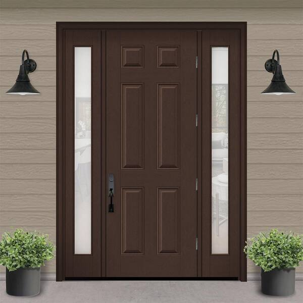 Regency 68 in. x 96 in. 6 Panel LHOS Chestnut Stain Mahogany Fiberglass Prehung Front Door w/Obscure14in. SLs 6-9/16