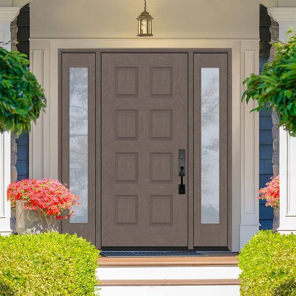 Regency 70 in. x 96 in. 8-Panel LHIS Ashwood Stain Mahogany Fiberglass Prehung Front Door with Dbl 12in. Sidelites