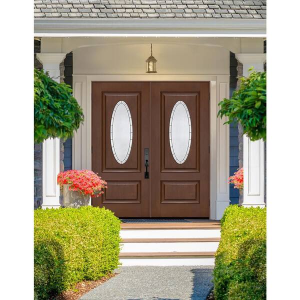 Regency 72 in. x 80 in. 3/4L Oval Empire Deco Glass RHOS Chestnut Fiberglass Double Prehung Front Door with 6-9/16 Jamb