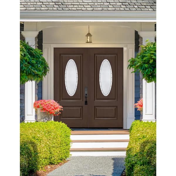 Regency 72 in. x 80 in. 3/4L Oval Empire Deco Glass RHOS Hickory Fiberglass Double Prehung Front Door with 6-9/16 Jamb