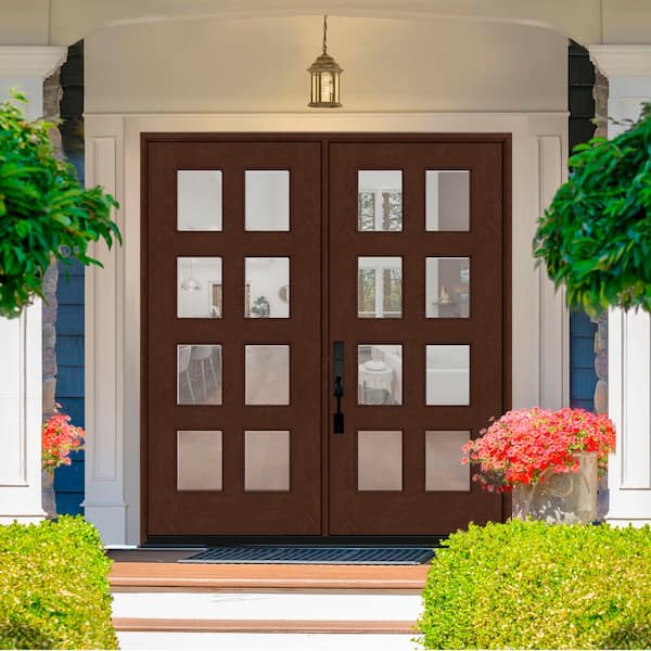 Regency 72 in. x 80 in. 8L Modern Clear Glass LHOS Chestnut Stained Fiberglass Double Prehung Front Door w/6 in. Jamb
