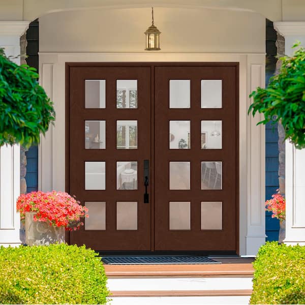 Regency 72 in. x 80 in. 8L Modern Clear Glass LHOS Chestnut Stained Fiberglass Double Prehung Front Door with 4 in. Jamb