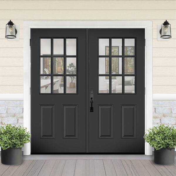 Reliant 64 in. x 80 in. 2P 1/2L 9L-SDL ClearGlass LHOS Black Finish Fiberglass Double Prehung Front Door w/6in. Jamb