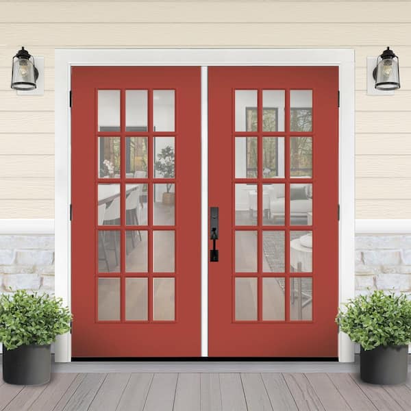Reliant 64 in. x 80 in. Full Lite 15L Clear Glass LHOS M. Red Finish Fiberglass Double Prehung Front Door 6 in. Jamb