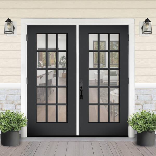 Reliant 64 in. x 80 in. FullLite 15L-SDL Clear Glass LHOS Black Finish Fiberglass Double Prehung Front Door w/4in. Jamb