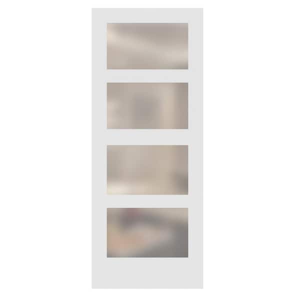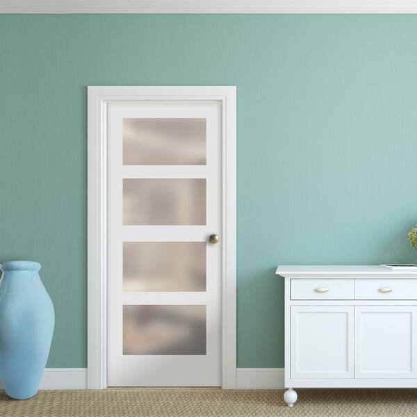28 in. x 80 in. Right-Handed 4-Lite Satin Etched Glass Solid Core Primed Wood MDF Single Prehung Interior Door