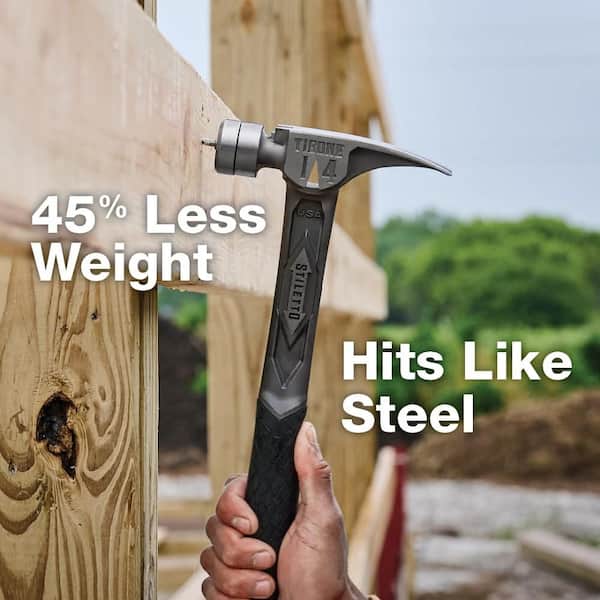 • This 14oz titanium hammer is 45% less weight and hits like steel