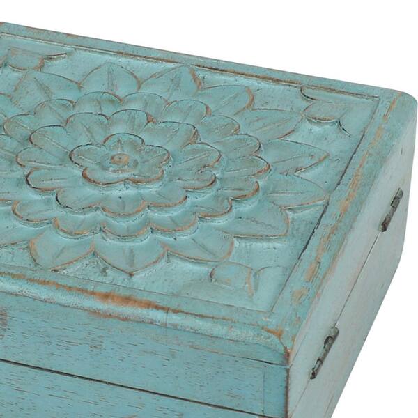 6 in. x 2.5 in. Weathered Sky Blue Wooden Box with Hinges and Carved Floral Design