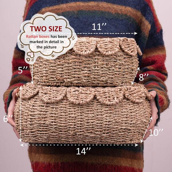 Storage Series: Brown 10 in. x 14 in. x 6 in. Seagrass Rattan Hand Round Wicker Storage Decorative Basket (Set of 2)