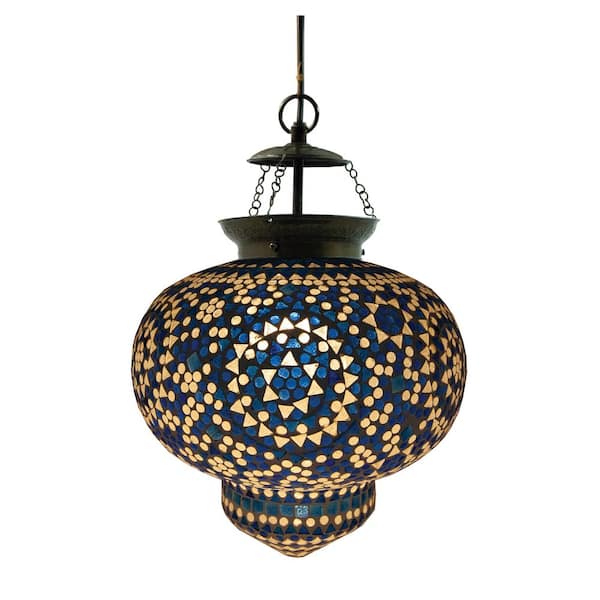 40-Watt 1 Light Antique Brass Finish, White and Blue Glass Mosaic and Metal Pendant Light