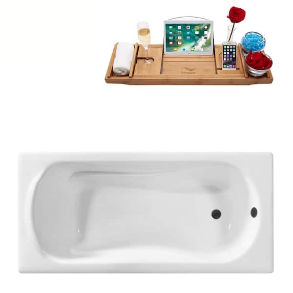 59 in. Cast Iron Rectangular Drop-in Bathtub in Glossy White with Matte Black External Drain and Tray