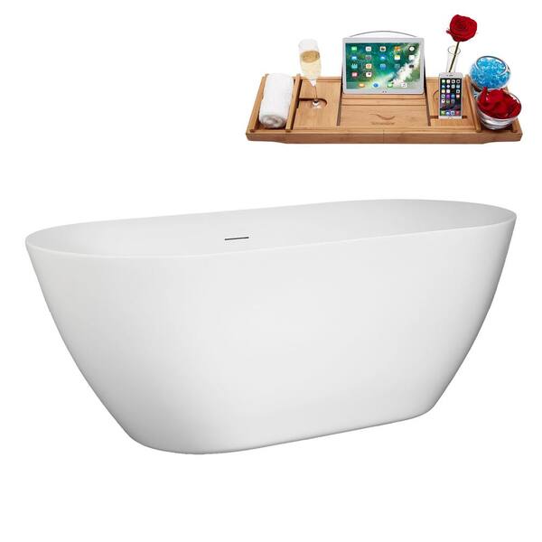 59 in. x 28 in. Acrylic Freestanding Soaking Bathtub in Glossy White with Brushed Brass Drain, Bamboo Tray