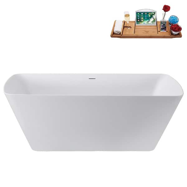59 in. x 28 in. Acrylic Freestanding Soaking Bathtub in Glossy White with Glossy White Drain, Bamboo Tray