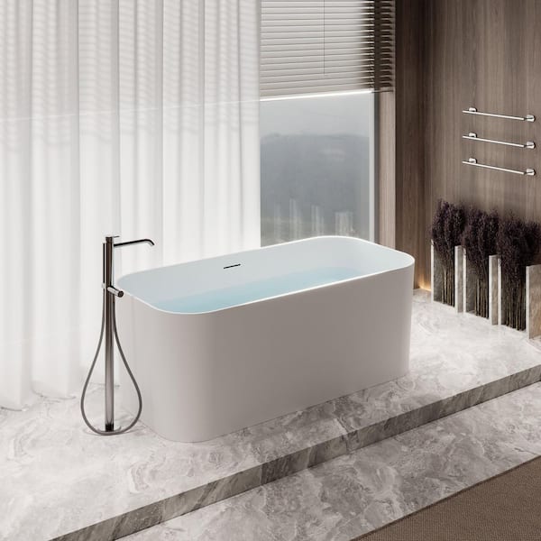 59 in. x 28 in. NS5780CH Stone Resin Freestanding Soaking Bathtub in Matte White with Polished Chrome Drain, Bamboo Tray