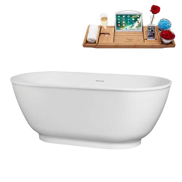 59 in. x 29 in. Acrylic Freestanding Soaking Bathtub in Glossy White with Polished Brass Drain, Bamboo Tray