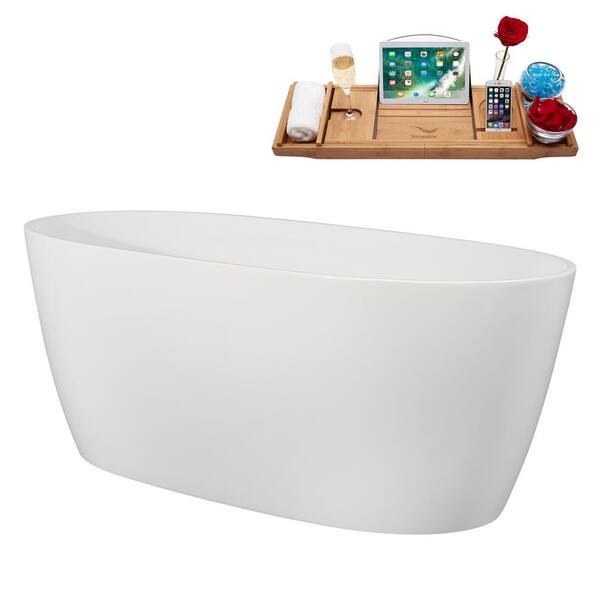 59 in. x 29 in. Acrylic Freestanding Soaking Bathtub in Glossy White with Polished Gold Drain, Bamboo Tray