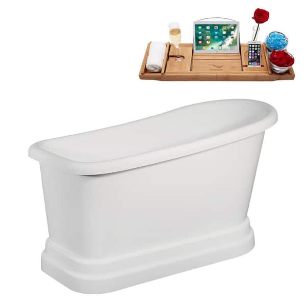 59 in. x 30 in. Acrylic Freestanding Soaking Bathtub in Glossy White With Matte Black Drain, Bamboo Tray