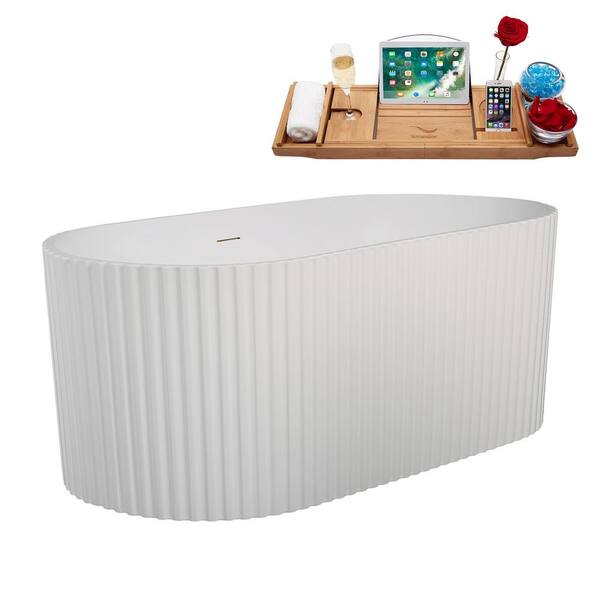 59 in. x 30 in. Acrylic Freestanding Soaking Bathtub in Glossy White with Brushed Brass Drain, Bamboo Tray
