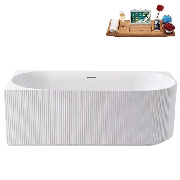 59 in. x 30 in. Acrylic Freestanding Soaking Bathtub in Glossy White with Matte Black Drain, Bamboo Tray