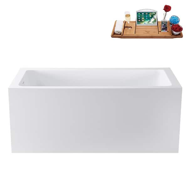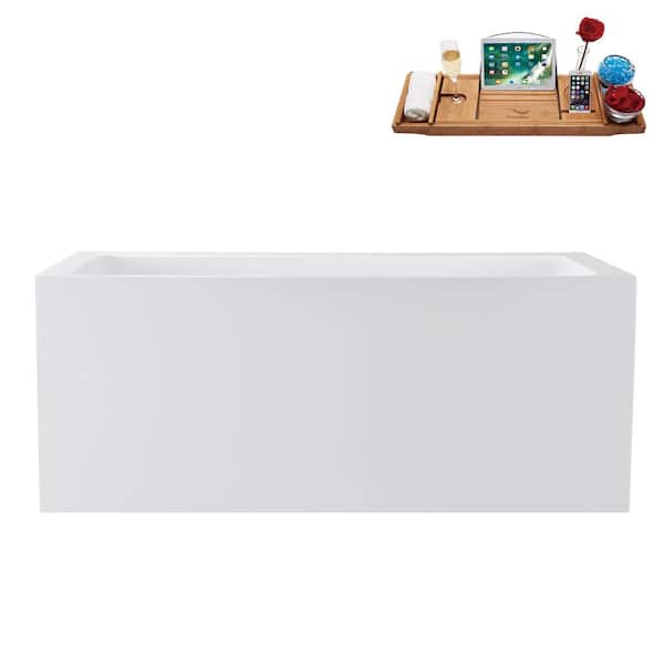59 in. x 30 in. Acrylic Freestanding Soaking Bathtub in Glossy White with Matte Oil Rubbed Bronze Drain, Bamboo Tray
